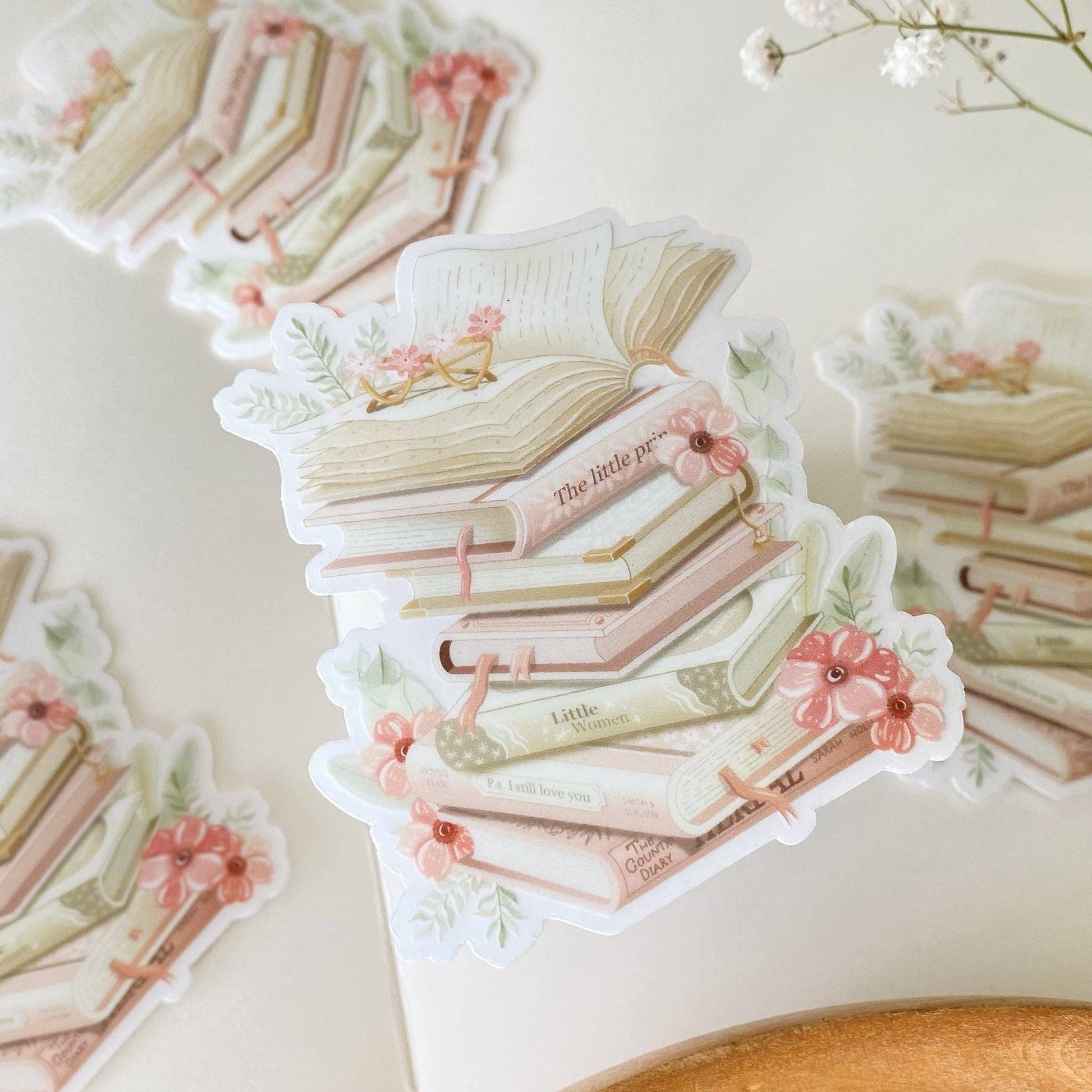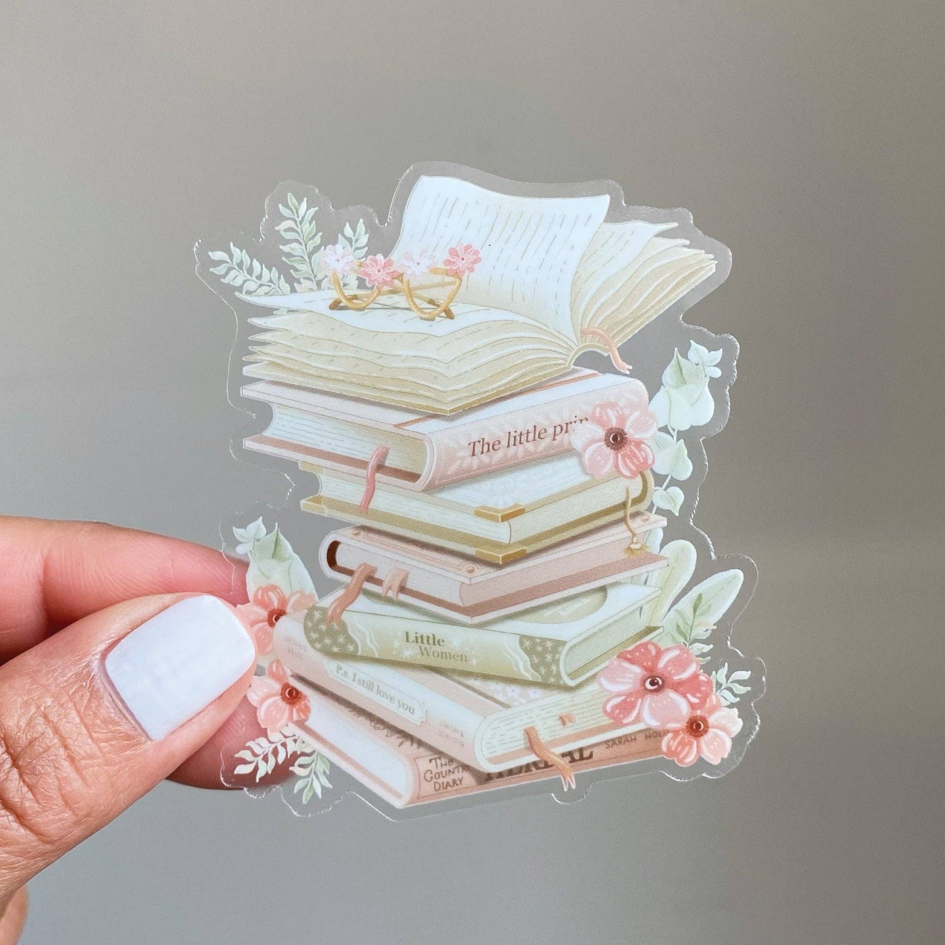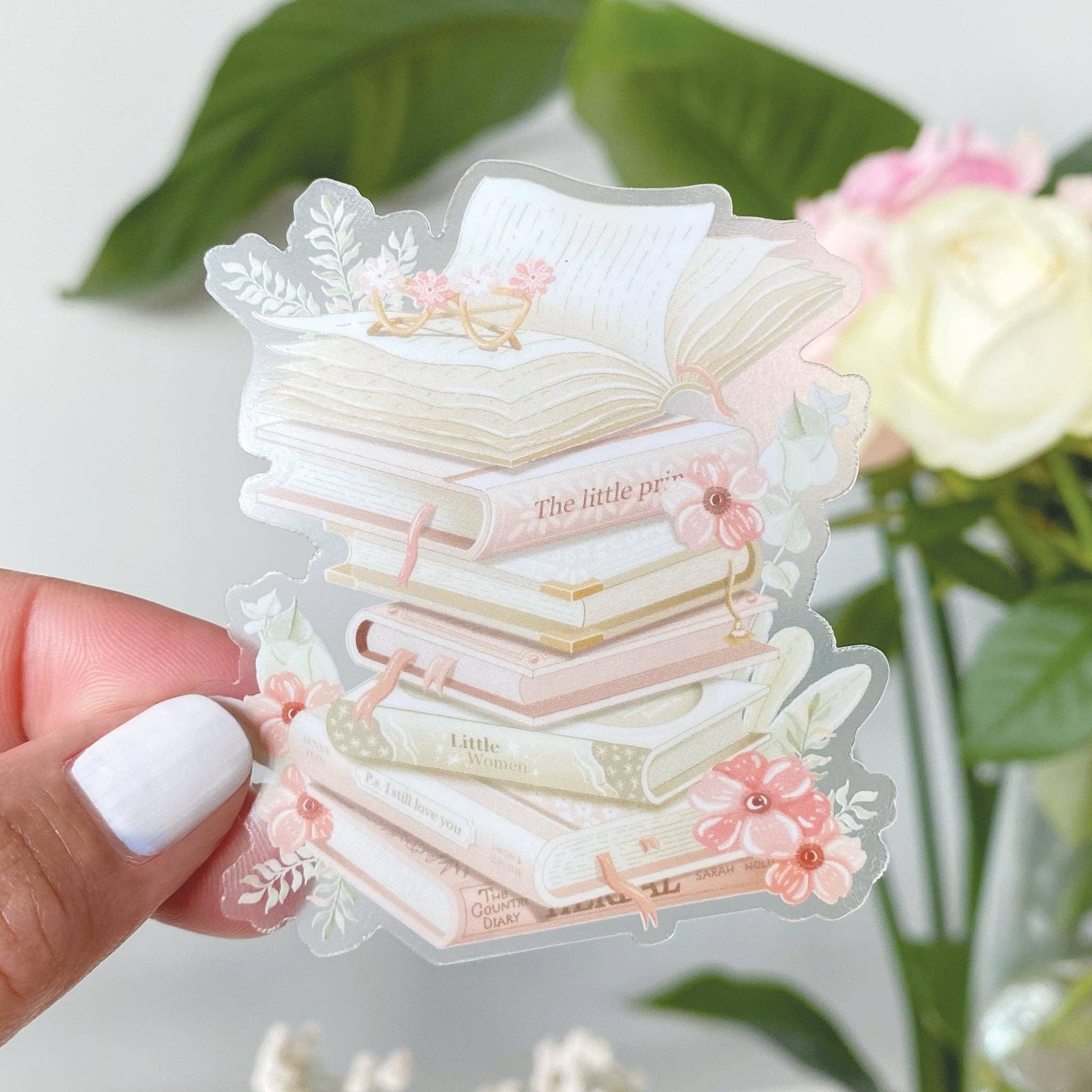 Clear vinyl sticker with various stacked books, and flowers. Perfect for book lovers.
