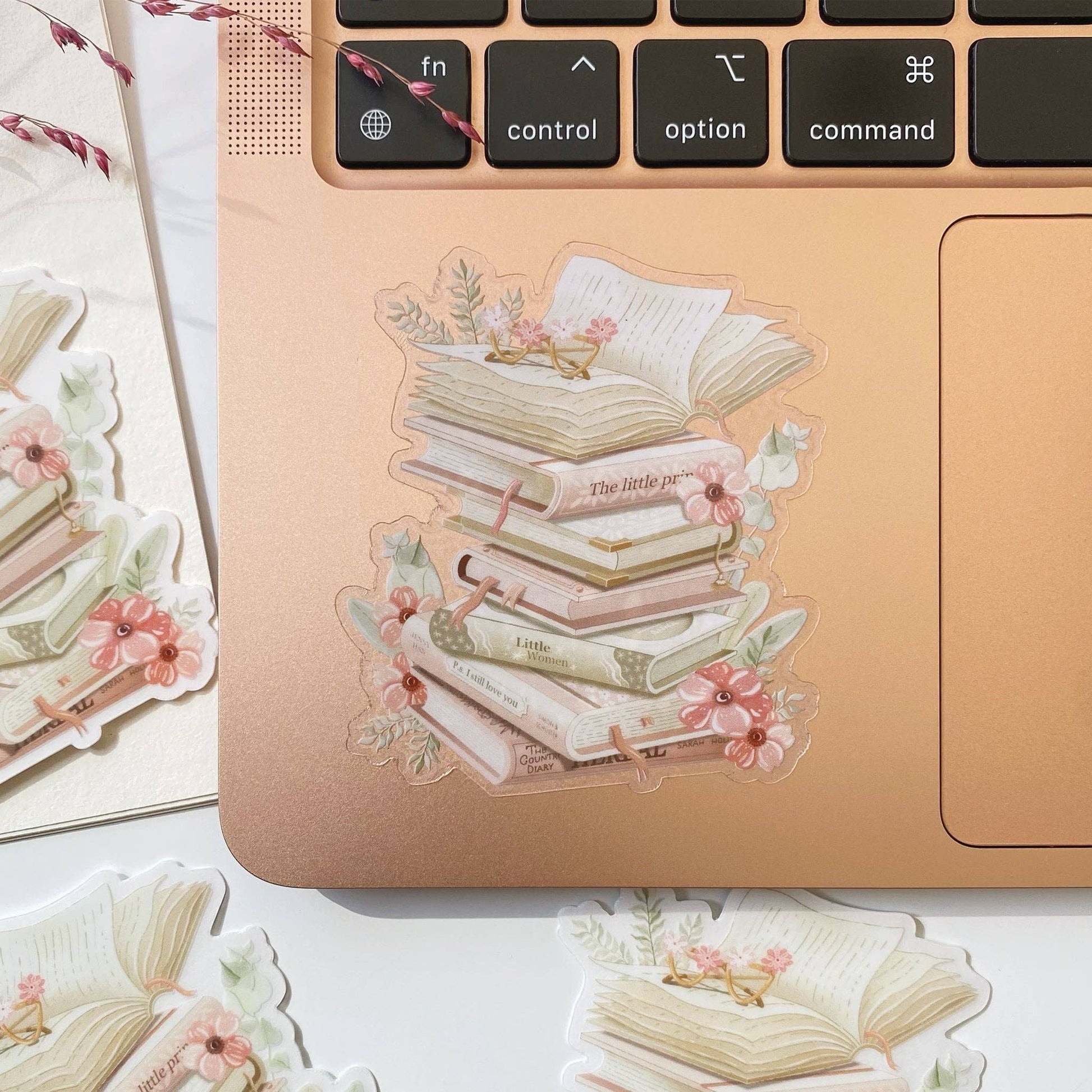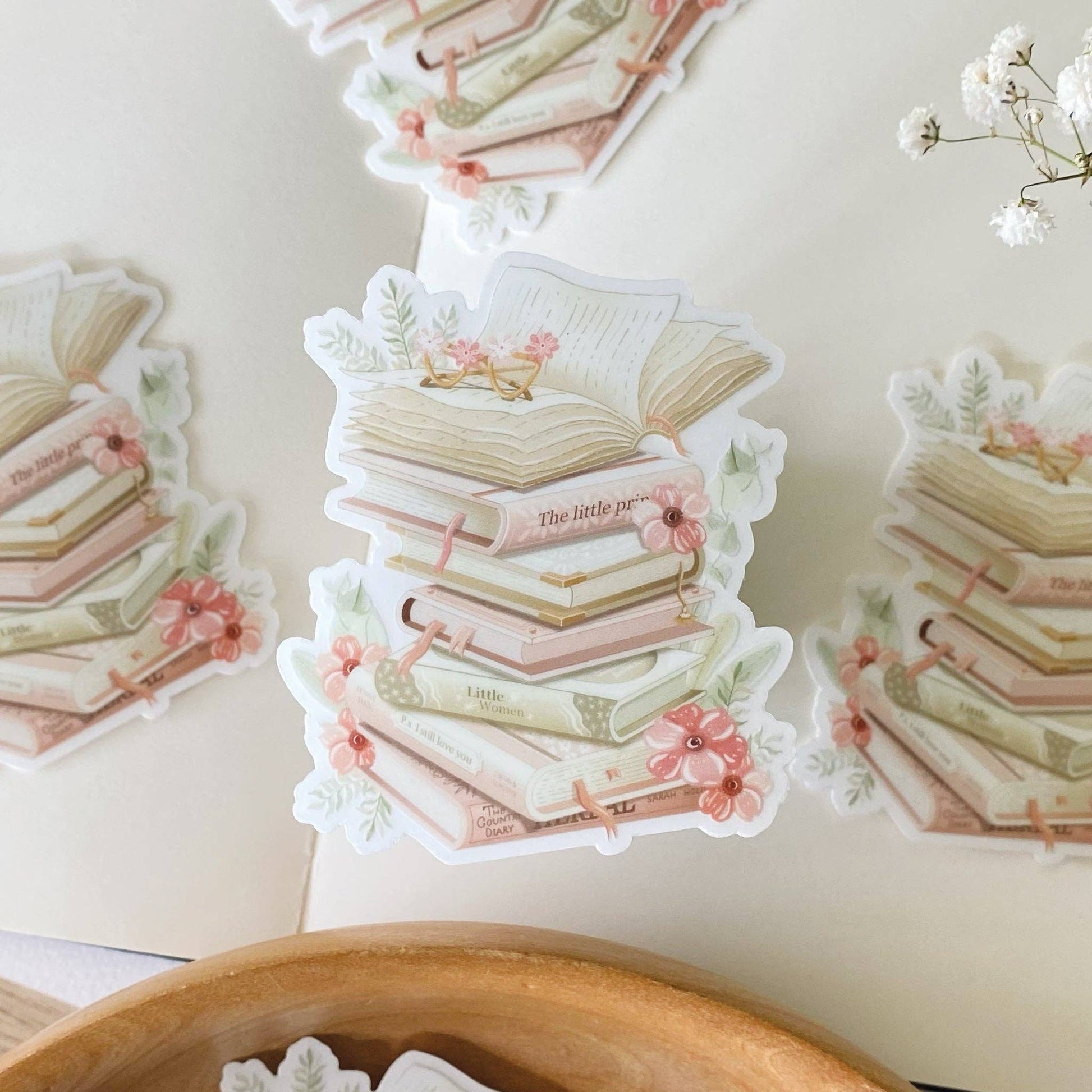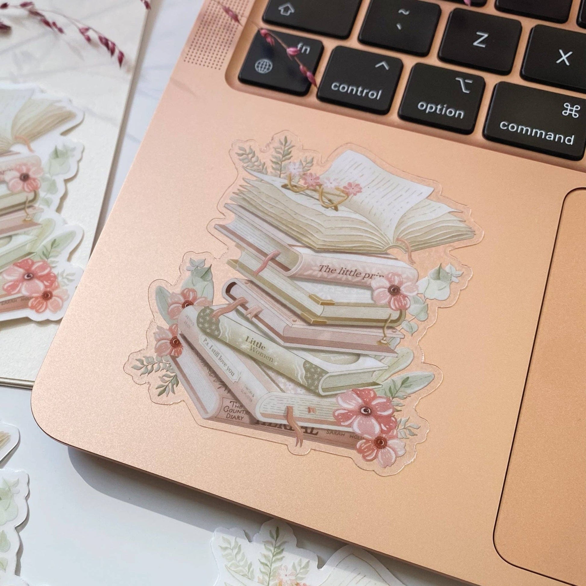 Clear vinyl sticker with various stacked books, and flowers. Perfect for book lovers.