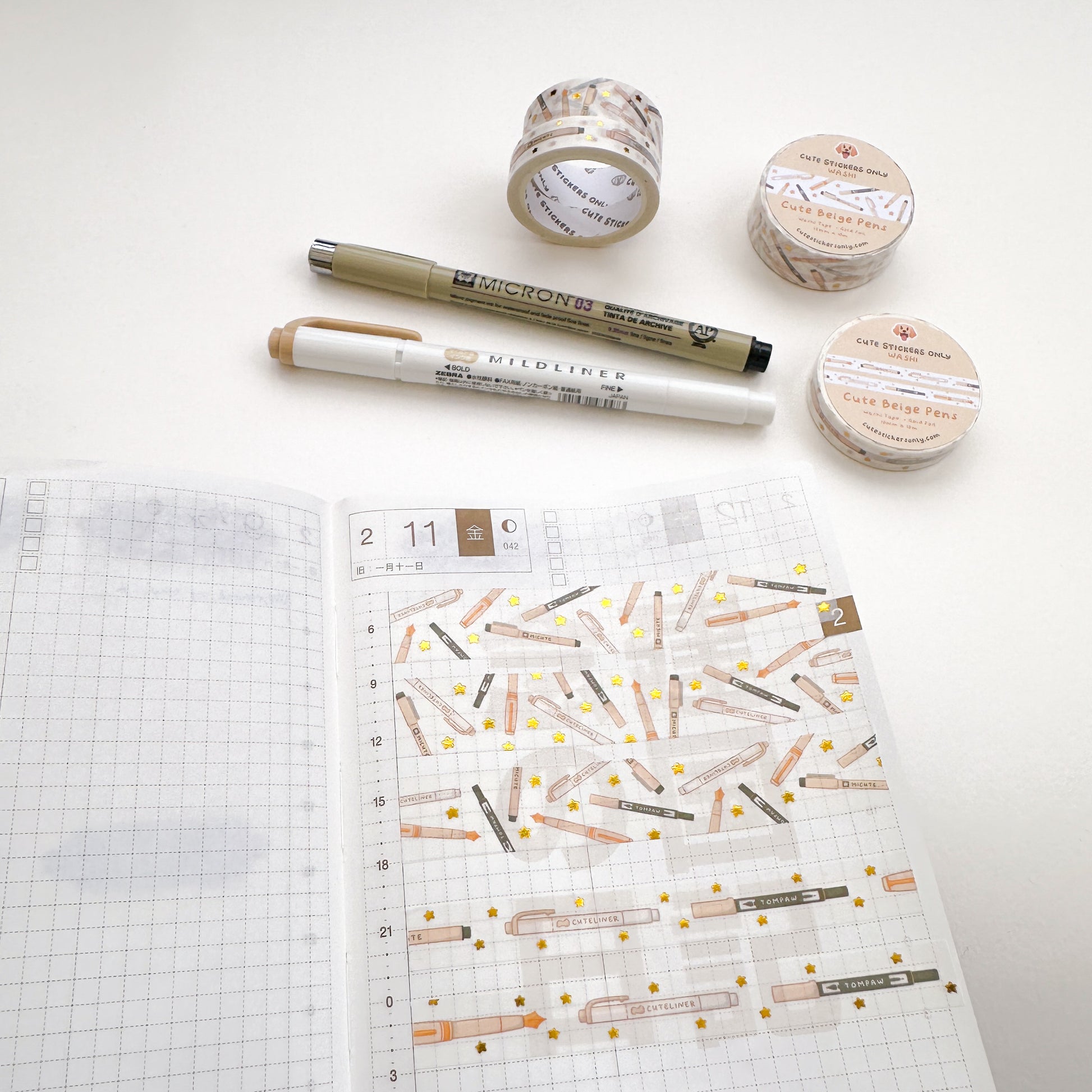 Cute Rainbow Pens v2 Washi Tapes (Set of 15mm + 10mm) with Gold Foil