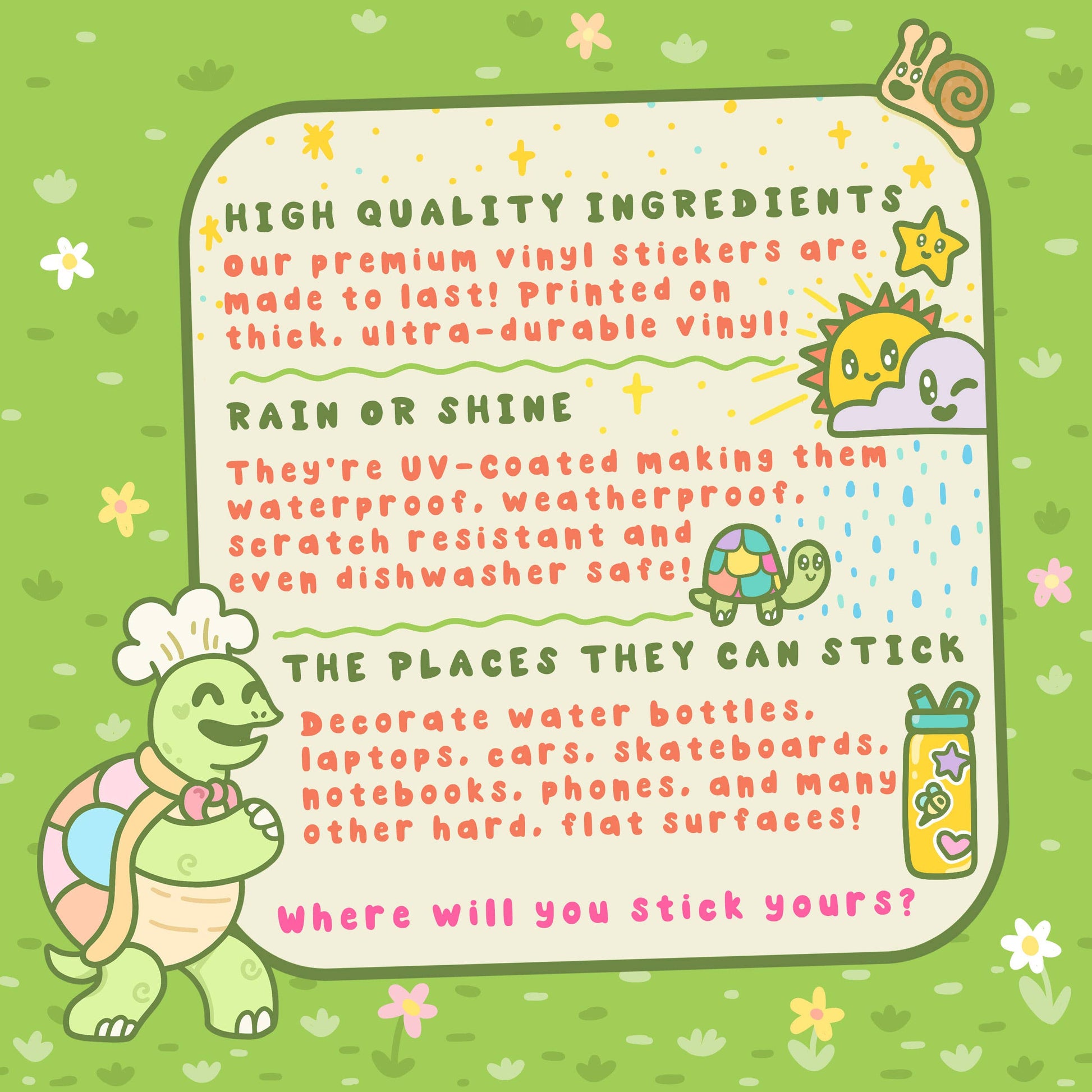 Our vinyl stickers are printed on Turtley Awesome premium vinyl with a permanent adhesive. Each one is coated with a protective laminate that makes them super durable & resistant to fading, scratching, tearing, and water. They can even be safely run through a dishwasher! 💦