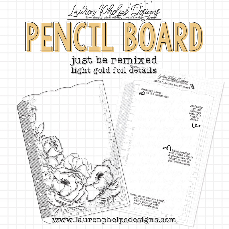 This transparent pencil board features exclusive artwork from LPD Just Be collection in light gold foil and guidelines for placing our handy Tab Tape washi tape! Simply slip this pencil board underneath the sheet when you are writing, and it will prevent indentations from a heavy hand or ink bleeding transferring to the next page. This staple should definitely be in your planner or journaling stash! Light Gold Foil Details.