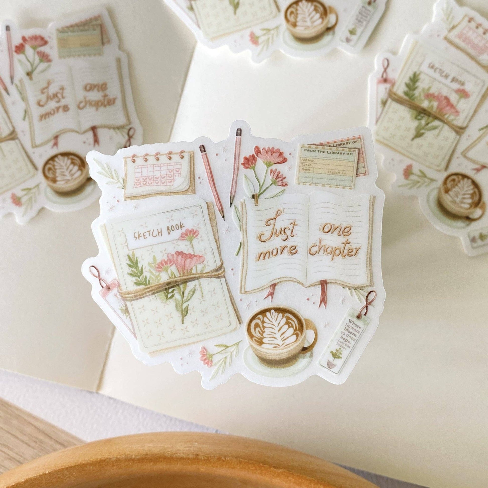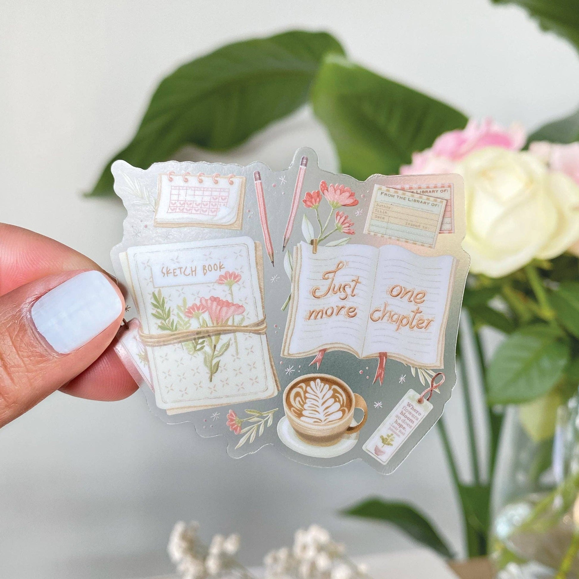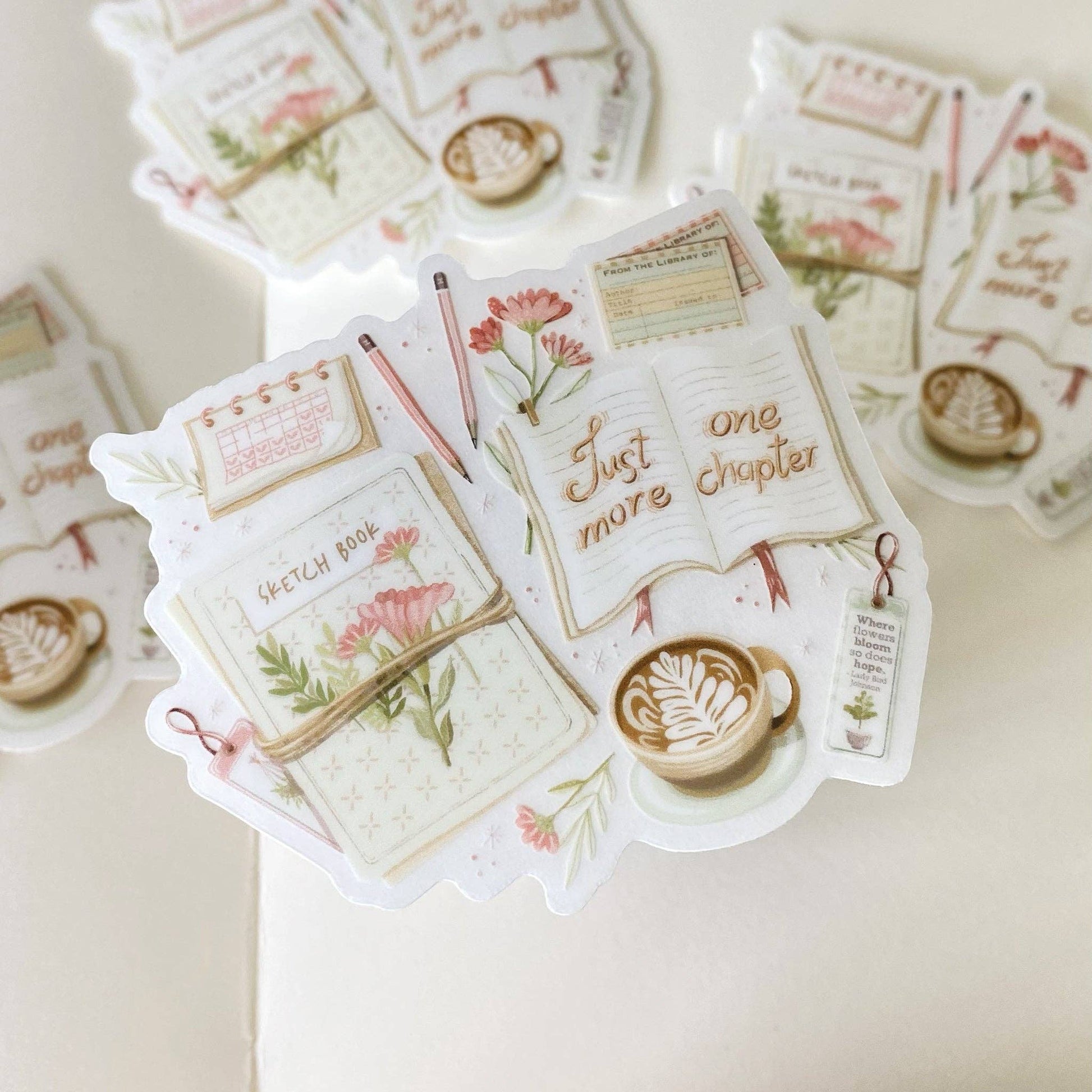 Clear vinyl sticker with a sketchbook, pens, a cappuccino, a book, and the text 'Just One More Chapter'. The perfect sticker for creative geniuses.