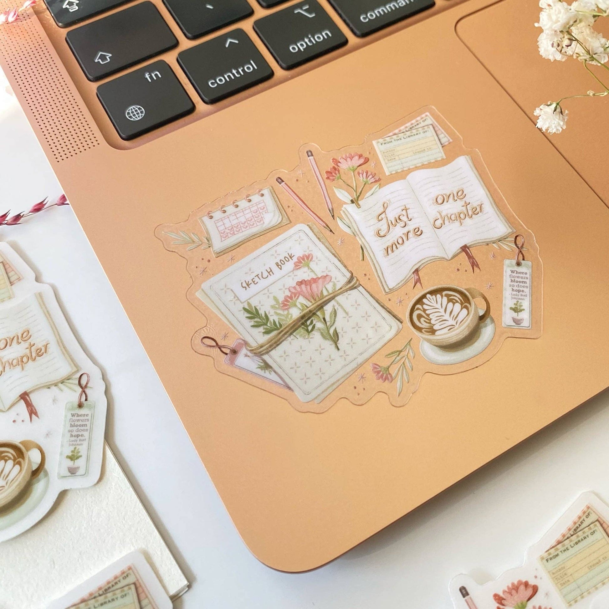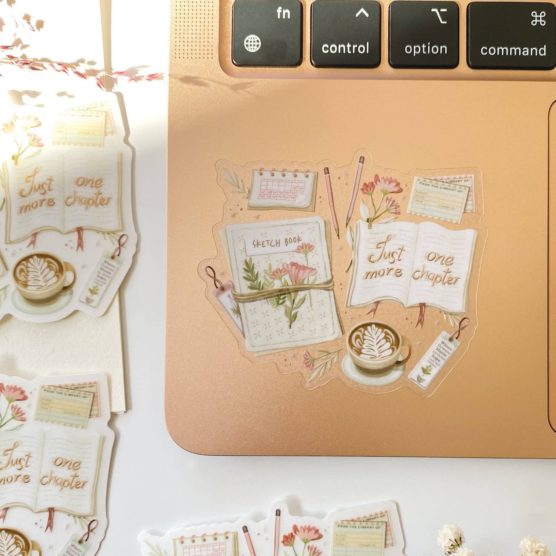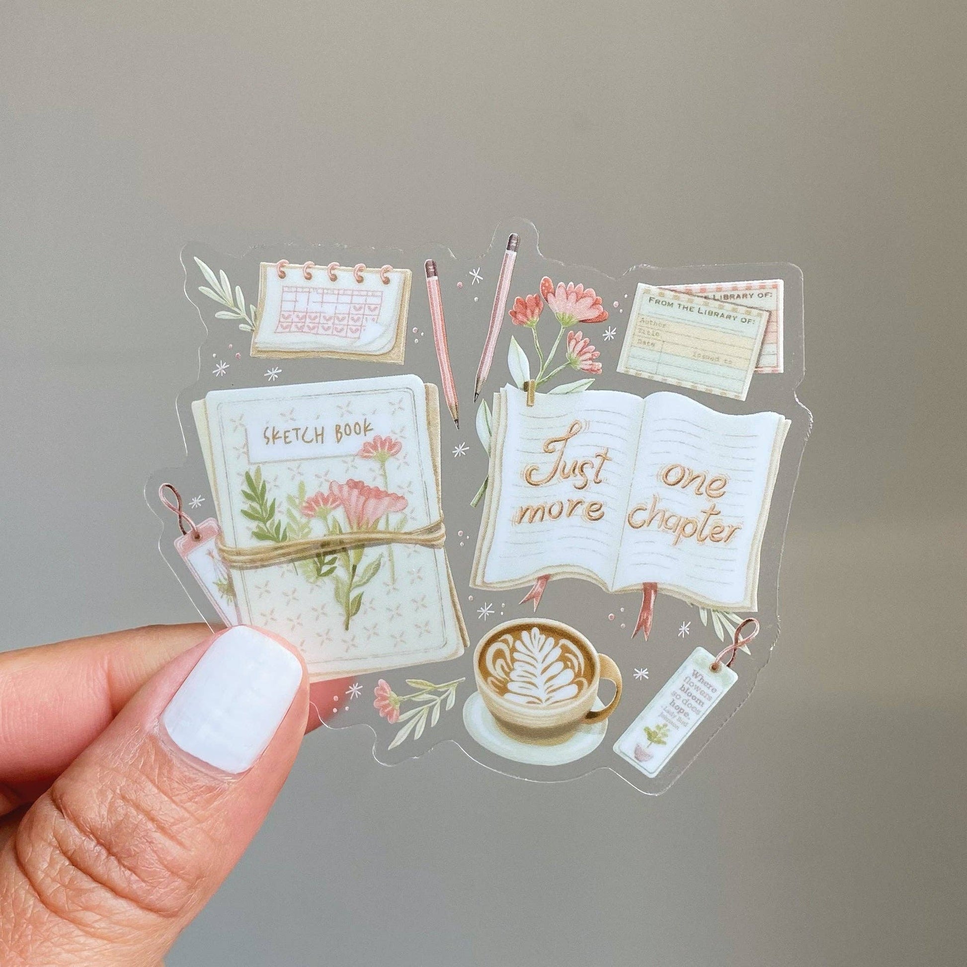 Clear vinyl sticker with a sketchbook, pens, a cappuccino, a book, and the text 'Just One More Chapter'. The perfect sticker for creative geniuses.