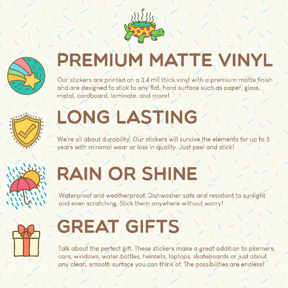 Our vinyl stickers are printed on Turtley Awesome premium vinyl with a permanent adhesive. Each one is coated with a protective laminate that makes them super durable & resistant to fading, scratching, tearing, and water. They can even be safely run through a dishwasher! 💦