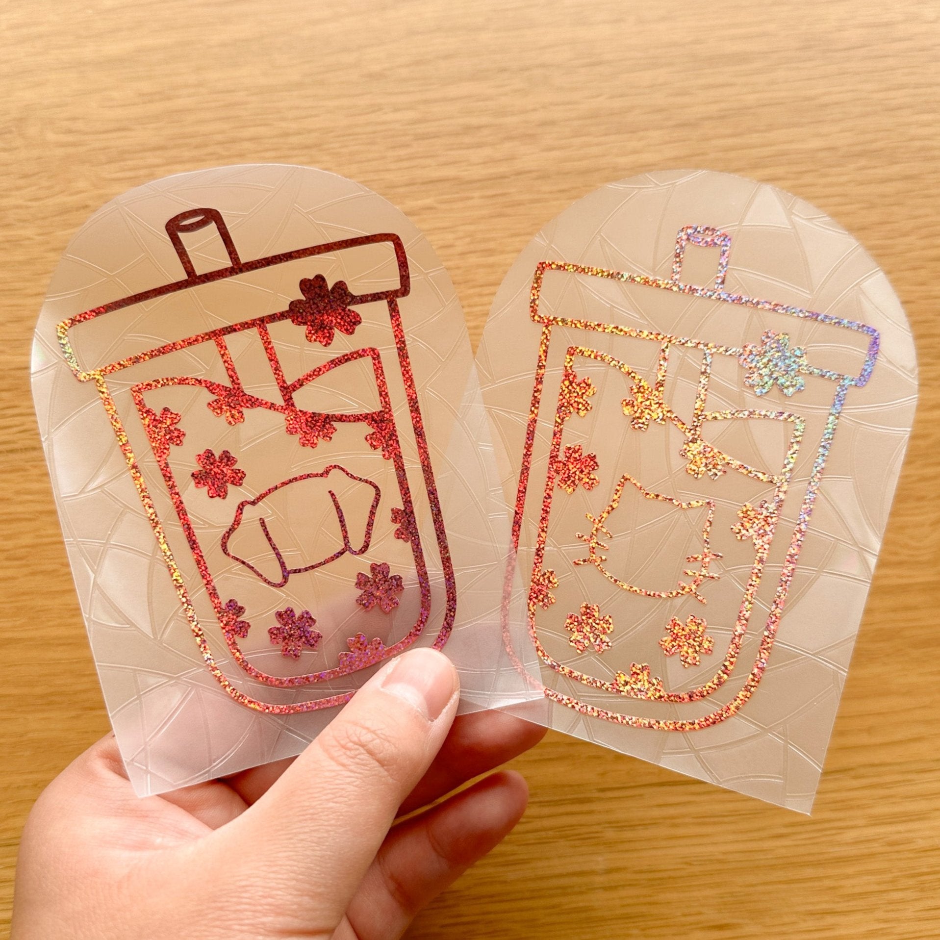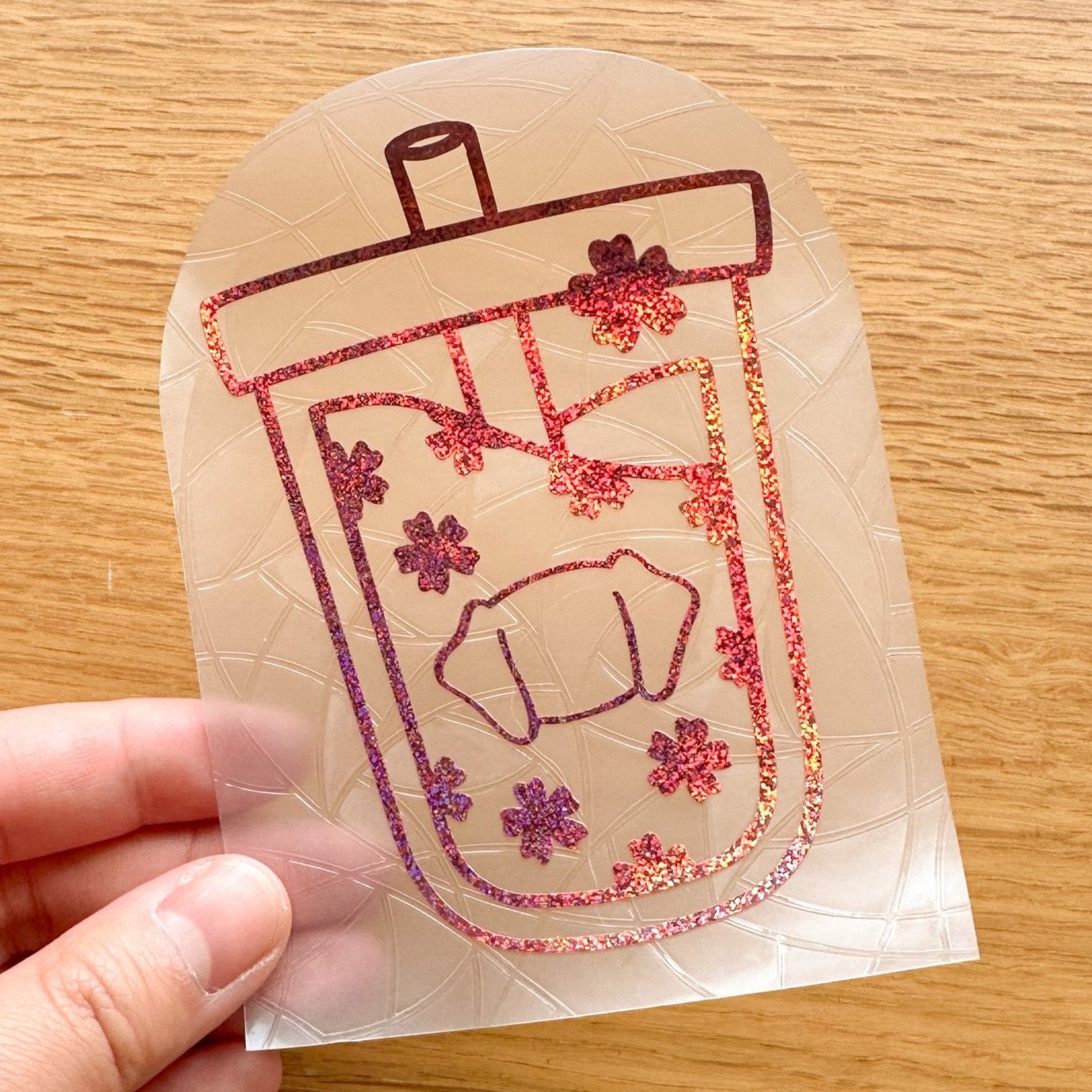 Window cling suncatcher sticker with pink holographic Joey or Cake sakura boba.
