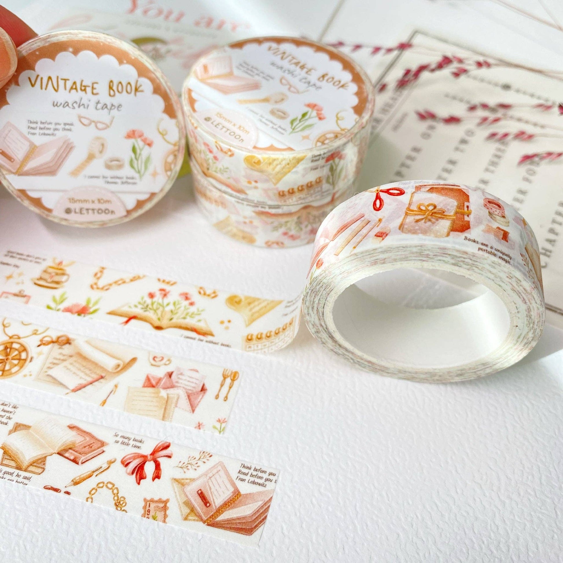 Vintage Book Washi Tape with envelopes, flowers, vintage items, books, famous quotes, and more!